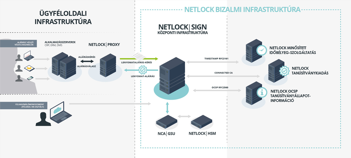 A lenyomatalapú NETLOCK│SIGN elektronikus aláírás-szolgáltatás magas szintű rendszerarchitektúrája lentebb látható egy tipikus, integrált vállalati informatikai környezetbe beépülve.