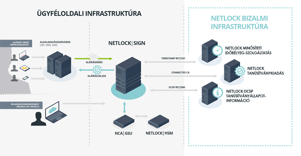 Amennyiben mind az aláíró kulcsokat, mind a teljes aláíró infrastruktúrát helyben szeretné használni az ügyfél, akkor az ügyfélhez telepített NETLOCK│SIGN megoldás választása ajánlott. Ennek a megoldásnak a magas szintű rendszerarchitektúrája lentebb látható egy tipikus, integrált vállalati informatikai környezetbe beépülve.