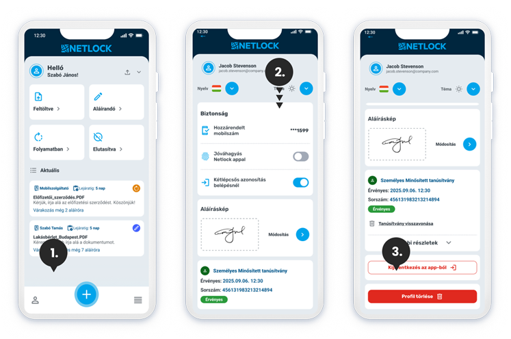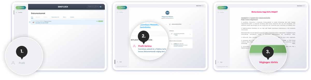 Az általános adatvédelmi rendelet 2016/679 EU irányelv értelmében Önnek joga van ahhoz, hogy az alkalmazásunkban felhasznált valamennyi személyes adatát és a fiókhoz tartozó összes dokumentumot törölje. Szeretnénk felhívni figyelmét arra, hogy amennyiben az adatok törlése mellett dönt, a felhasználói fiók is törlődik, továbbá, ha érvényes tanúsítvánnyal rendelkezik, a fiók törlésével tanúsítványa azonnal visszavonásra kerül, ez esetben a fiókja, illetve a tanúsítványa sem állítható vissza.
