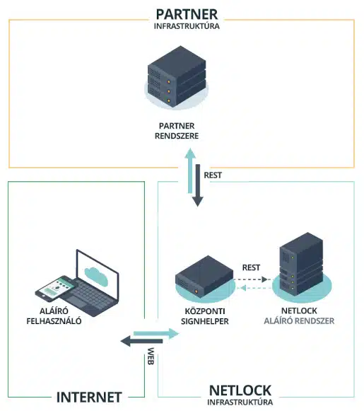 Központi SIGNHELPER (KoSH) esetén a bizalmi szolgáltató felhőbe telepített modulja kerül felhasználásra REST hívásokkal, ebben az esetben dokumentum feltöltésre kerül a NETLOCK központi SIGNHELPER-be, viszont nem igényel további telepítést a partner oldalon, valamint az aláírandó/aláírt dokumentum elérését is biztosítja az aláírók – felhasználók számára.